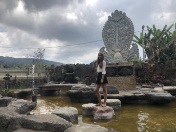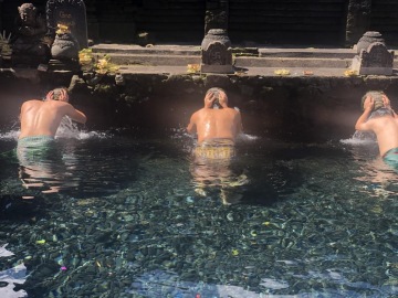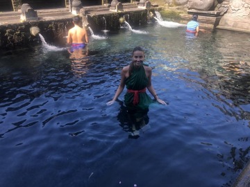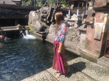 Chrám očištění, který je extrémně přecpaný turisty. Snad budete mít větší štěstí a nepotkáte jich tam tolik, co my. Až úplně u chrámu si můžete zapůjčit sarong, který tu je zdarma, ale v tomto sarongu nesmíte vstoupit do vody, na to jsou jiné sarongy za poplatek. Pokud chcete vlézt do bazénku a očistit se, tak si vezměte buď svůj vlastní sarong anebo vpravo od vstupu uvidíte půjčovnu se šatnou na převlíknutí. Pod sarongem si nechte plavky a můžete vyrazit na očistu. Jsou tam celkem tři bazénky, do kterých smíte vstoupit. Voda je studená a plavou v ní velké ryby. Přede mnou šli dva balijci a radili mi, pod které prameny mohu a pod které nesmím vlézt. Takže v prvním bazénku nechoďte pod druhý a třetí zprava. V druhém bazénku můžete pod všechny a ve třetím bazénku jděte jen pod ten první, ze kterého byste se měli dvakrát napít, což jsem teda neriskovala. V dalších se oplachují mrtvé. Turisti i tak chodili pod všechny anebo tak nějak různě. Mokrý sarong se zase vrací u šaten. U východu budete procházet přes trhy a pokud si chcete nakoupit za pár kaček, tak doporučuji projít celým trhem a až ke konci si koupit to, co se vám líbí. My si na totiž na začátku koupili sarongy a na konci trhu nám je nabízeli o polovinu levněji.