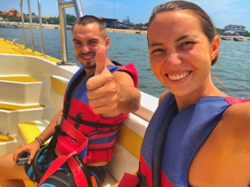Pokud byste radši zkusili wakeboarding za lodí, tak to si zajeďte třeba na Nusa Dua. Budete muset hoodně smlouvat. Za lodí je wakeboarding dražší a zajezdíte si jen 20 minut.