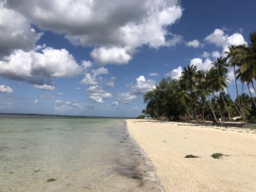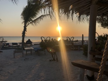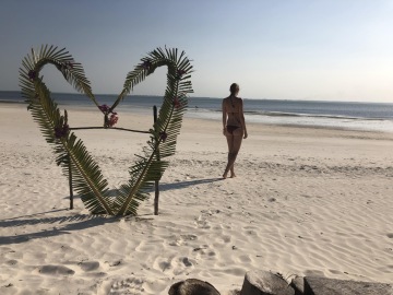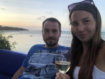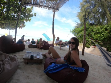Ve 13:30 jsme vypluli loďkou na protější pláž. Tam je to opravdu jak v ráji. Bílý, jemný písek, sítě, houpací postele, z palem vytvořený srdíčka a skvělej bar s hudbou. Byli jsme tam až do západu slunce. Na hotel jsme už pluli krokem a za úplné tmy. Pod námi korály a kameny a nikdo neviděl na krok. Na pevninu jsme se všichni dostali v pořádku.