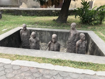 Došli jsme ke kostelu, vedle kterého je postavená mešita. Kostel patří do komplexu, do kterého se musí platit vstupné. Patří tam ještě výstava fotografií a památník otroků. Cena je 5 dolarů na osobu. V tomto kostele se prodávali otroci a přímo pod kostelem byli malé kobky, ve kterých všichni otroci byli namačkaní. Byli jsme ve dvou malých místnostech a prý v nich bylo 150 otroků. Všechny ty řetězy tam jsou prý původní. Běhal mi mráz po zádech. Za kostelem je památník otroků s řetězy kolem krku. Stáli jsme tam v tichosti a koukali na sochy.