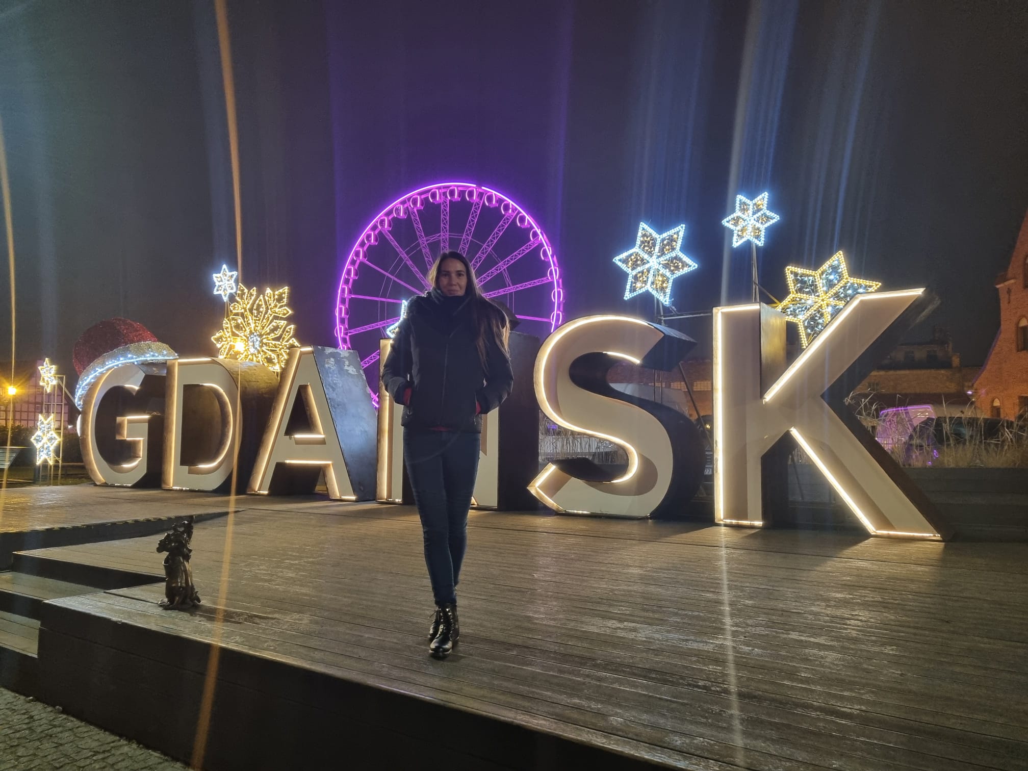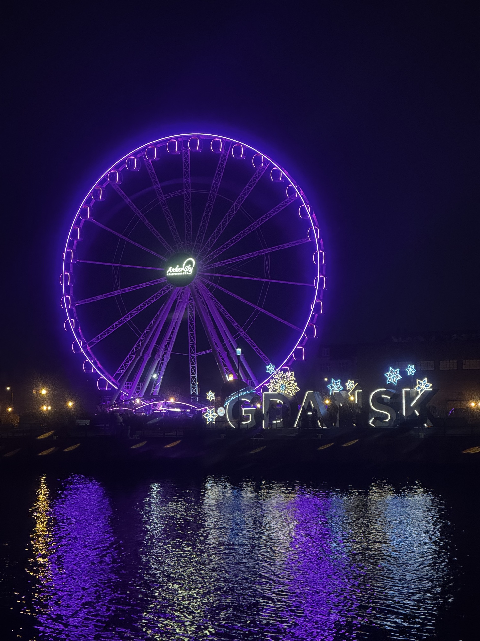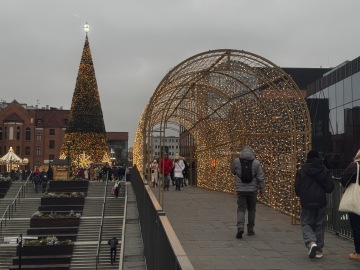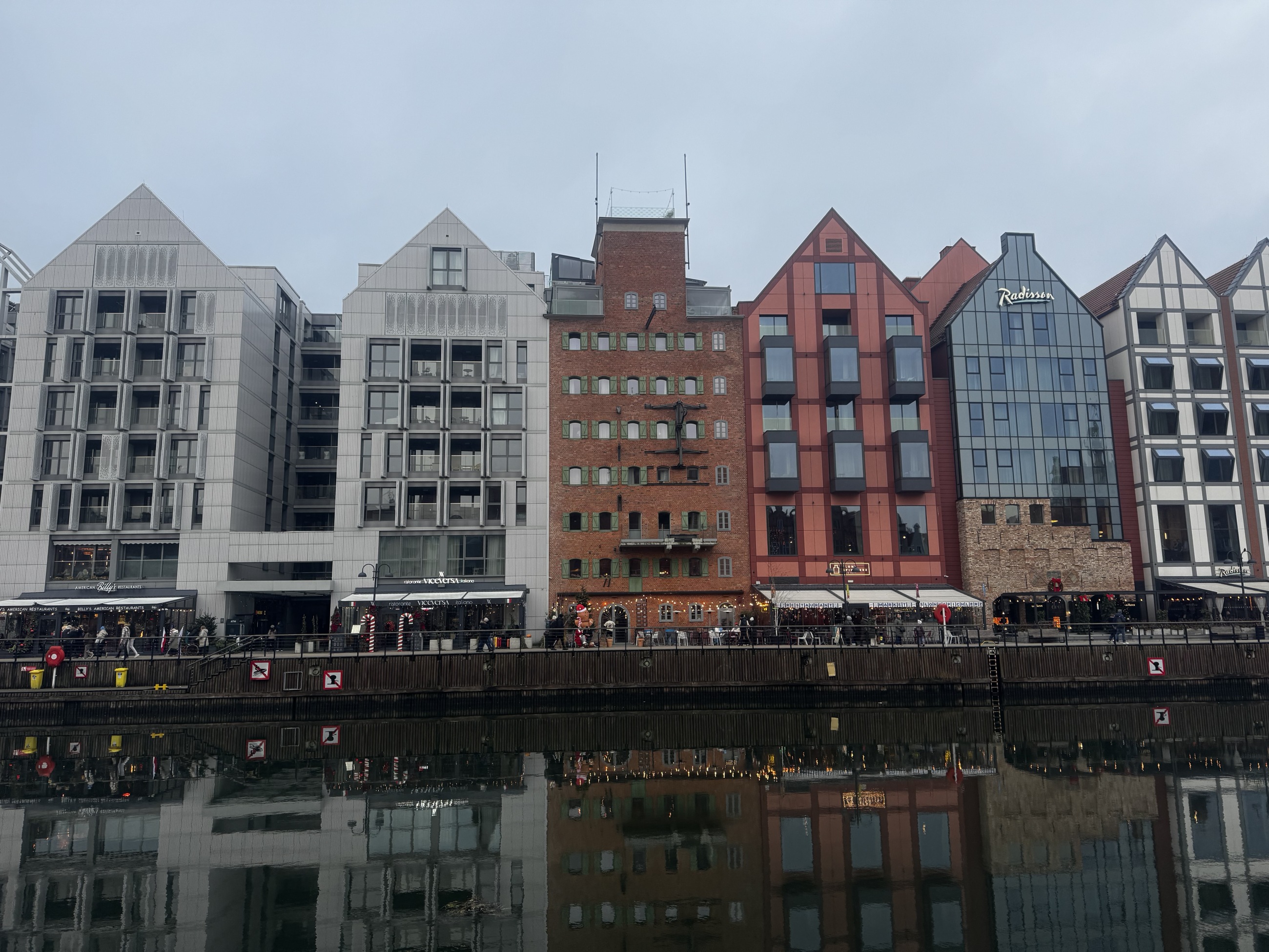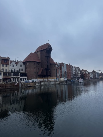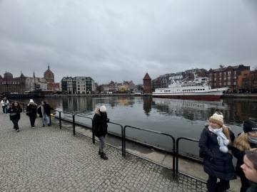 Procházka z centra podél řeky k neonovému nápisu Gdaňsk a ruskému kolu. Cestou je středověký portovní jeřáb, který zároveň sloužil jako vodní brána.