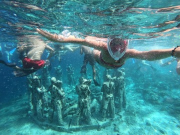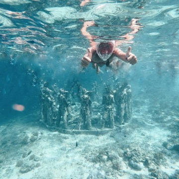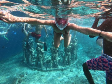 Další den jsme pluli na potápění s želvami. Je to u ostrova Gili Meno (mapa na konci článku) a musím říct, že tam nebylo ani tolik lidí na to, kolik tam bylo želv. Šnorchlování je v několikametrové hloubce. Moře je krásně čisté a želvy jdou vidět i z lodi. Poté jsme pokračovali k podvodním sochám. Na Google mapách to najdete jako NEST - zde (nebo na mapce na konci článku), kde bylo několikrát víc lidí než u želv. Z Gili Meno se tam dá i doplavat. Bylo tam opravdu šíleně lidí. Nechápu, kdy si ty lidi tam dělají fotky a jsou na nich sami. Lidi po sochách šlapou, stojí na nich. Všichni do sebe kopou. Je to šílenost. Zdrželi jsme se asi 5 minut. To nám stačilo. Nakonec nás už jen hodili na Gili Trawangan přímo před náš hotel.