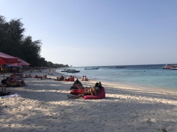 Ubytovali jsme se v bungalovech Adinda. Na jednu noc nás to stálo 537 Kč se snídaní. Ubytování není nic moc, ale je přímo u pláže. Z přístavu bylo ubytování asi tak 10 - 15 minut pěšky. Na ostrově není možnost zapůjčení skútru. Jezdí se tu jedině drožkou nebo na kole. Zapůjčili jsme si 2 kola za 80.000 IDR. Jezdí se ale celkem špatně. Všechny cesty nejsou z asfaltu ale spíše jen písečné cesty. Takže se s kolem pěkně zahrabete. Na sever ostrova se vůbec na kole nedostanete. Je to ale sranda a určitě to zkuste:)