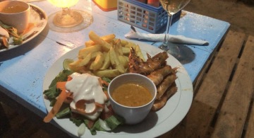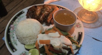 Tady jsme bydleli a také skončili na večeři. Před restaurací mají rybí trh. Vyberete si, co chcete k jídlu a už se vám to griluje. Krevety s přílohou a salátem a víno (to vše dvakrát) stálo 450.000 IDR.