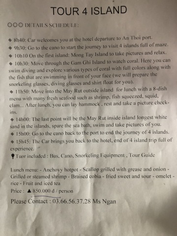 - Tenhle výlet jsme si zarezervovali přes recepci na našem ubytování. Výlet zahrnoval: Plavbu na 5 ostrovů, oběd (bez nápojů)