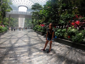 Vystupujeme na letišti v Singapuru a už jsme v úžasu. Na letišti mají vodopád přes dvě patra. Letiště je propojené rovnou s obchoďákem a kolem vodopádu jsou zelené terasy stromů a květin. Prostě nádhera. Voní to tu, je tu čerstvý vzduch a cítíme se tu skvěle.