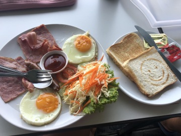V termínu, kdy jsme tu my, tu je nějaká akce, a tak na nás zbyl poslední volný pokoj nejnižší třídy. No, je to strašný. Špína, neuklizeno, všude vlasy a chlupy, v okně hnízdo ptáků a seno, ze kterého si postavili hnízdečko nám padá do koupelny. V pokoji nám běhá ještěrka. Není kam si vybalit. Máme tu jeden maličký stolek a maličkatý noční stolek. Toť vše. :D Ale nestěžuji si, jsem přeci zase v mém milovaném Thajsku.