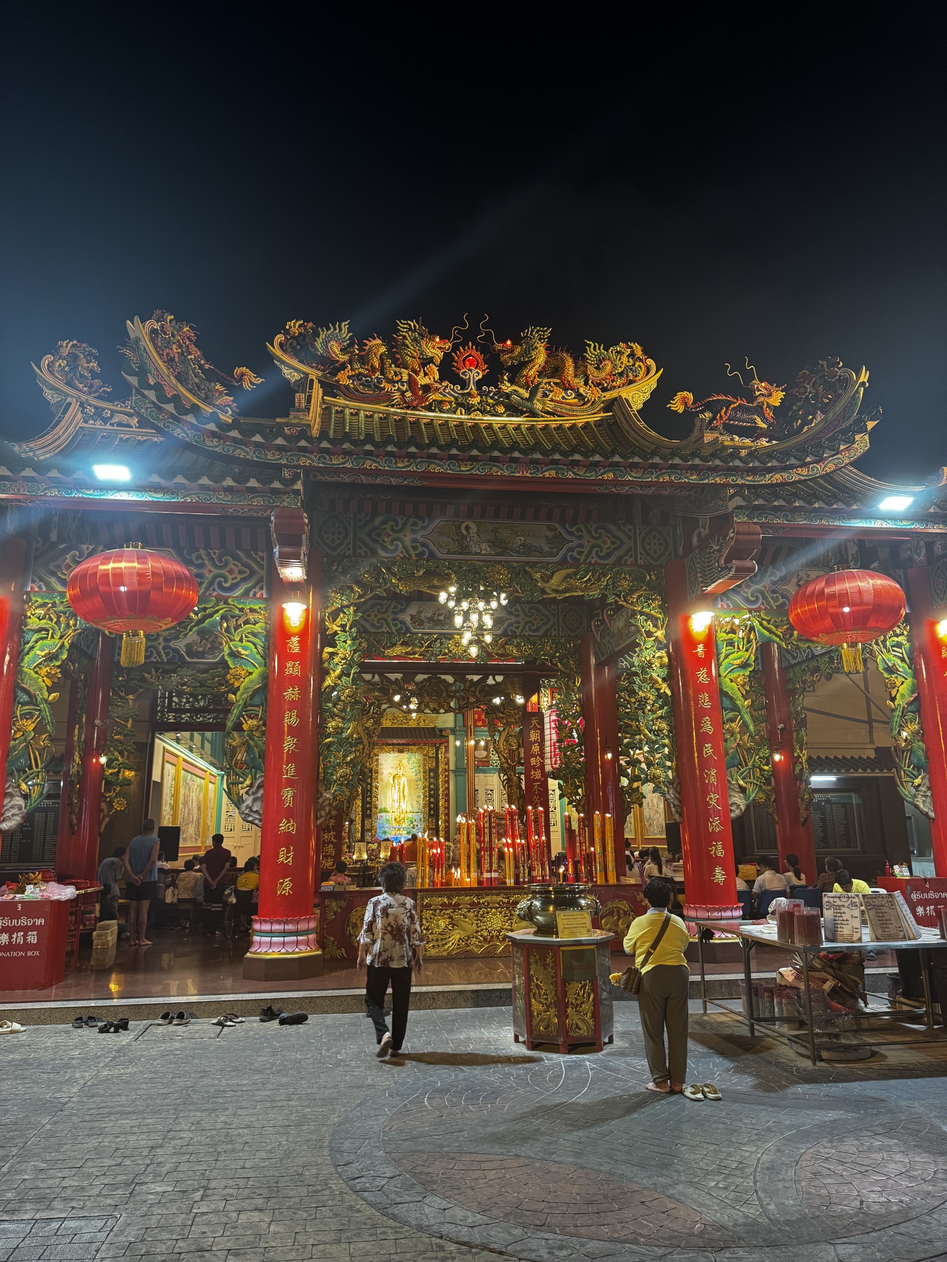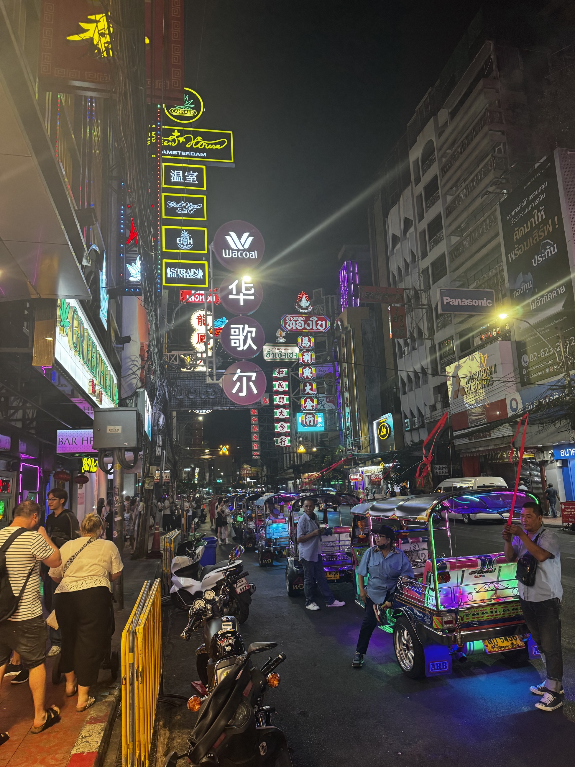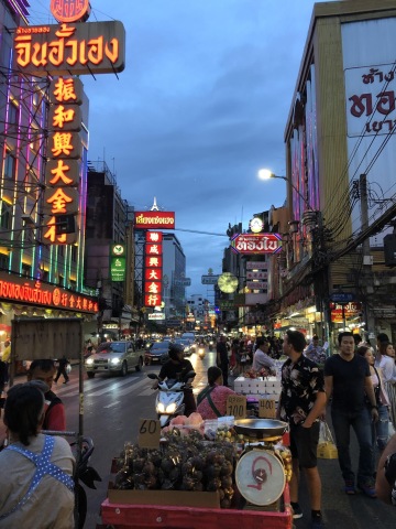 Začněte u Wat Traimitr, který je kousek od hlavního nádraží. Je to jeden z dalších chrámů, tak pokud Vás ještě neomrzeli, tak se tam běžte podívat. Od tohoto chrámu pokračujte do ulice Yaowarat, kde se můžete najíst na každém rohu. Určitě tam zajděte, až se setmí! Čínská čtvrť je osvětlená nápisy a všude jsou prodejci a je stále na co se dívat.