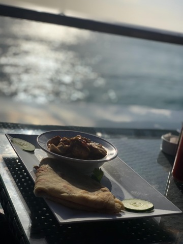 Restaurace s terasou a výhledem na západ slunce. Najdete jí za Z hotelem cestičkou od veřejné pláže. (viz poslední foto)